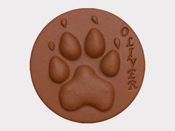 Using your pets clay paw print, we make a reverse mold and then create a 3D impression. You are able to feel the grooves and ridges of their paw. Pictured above is a computer generated example. We have more examples in our office.